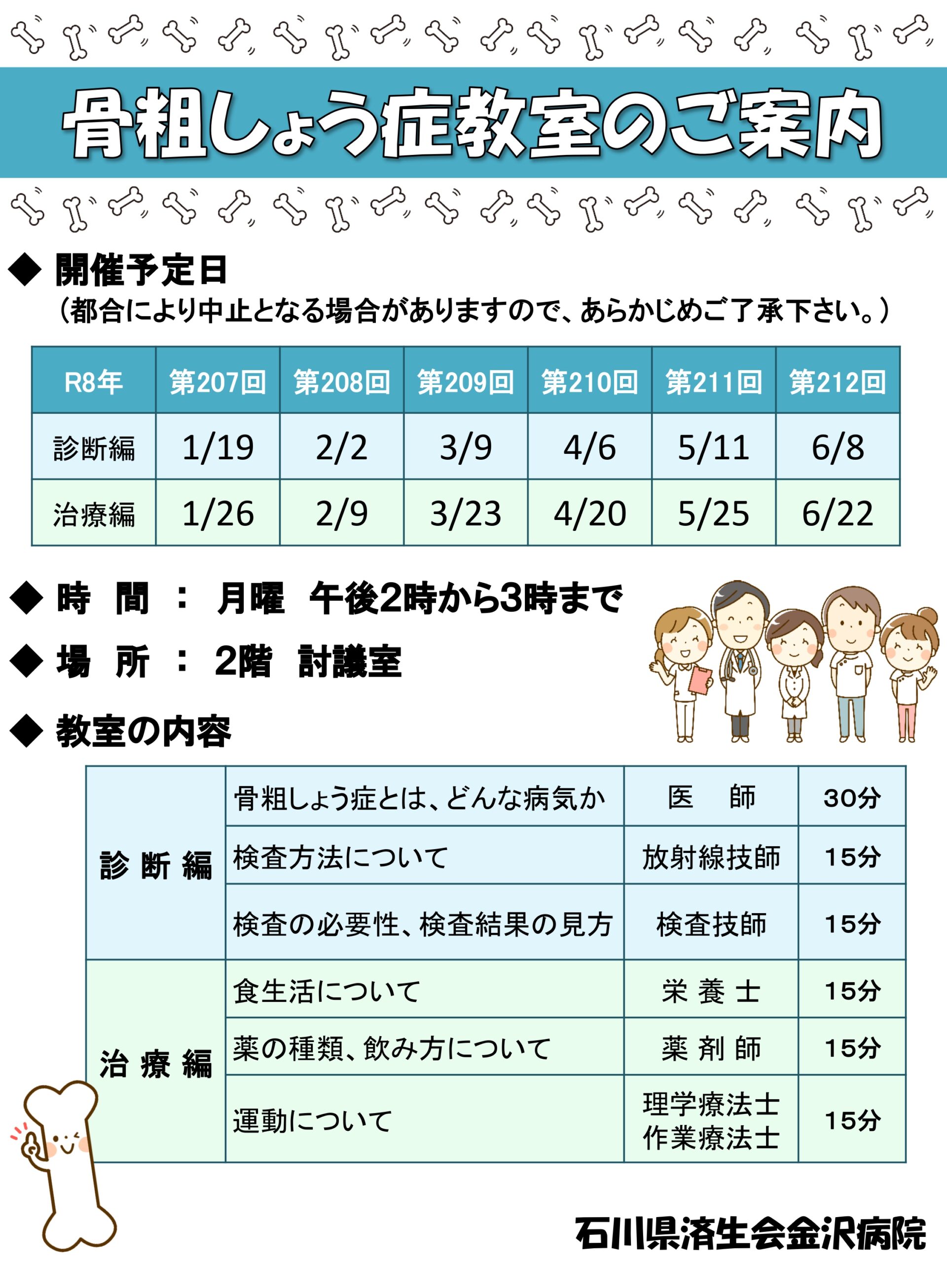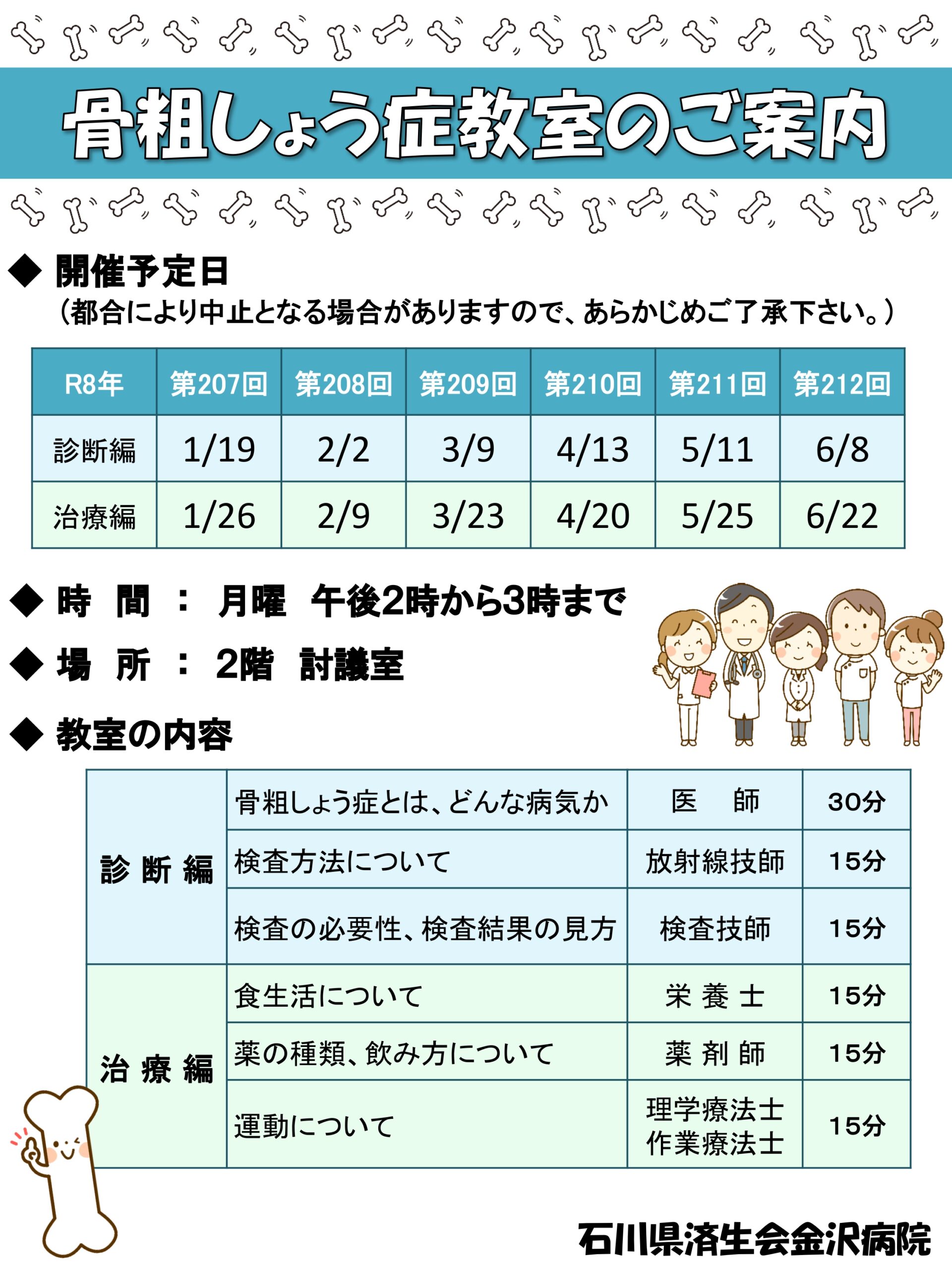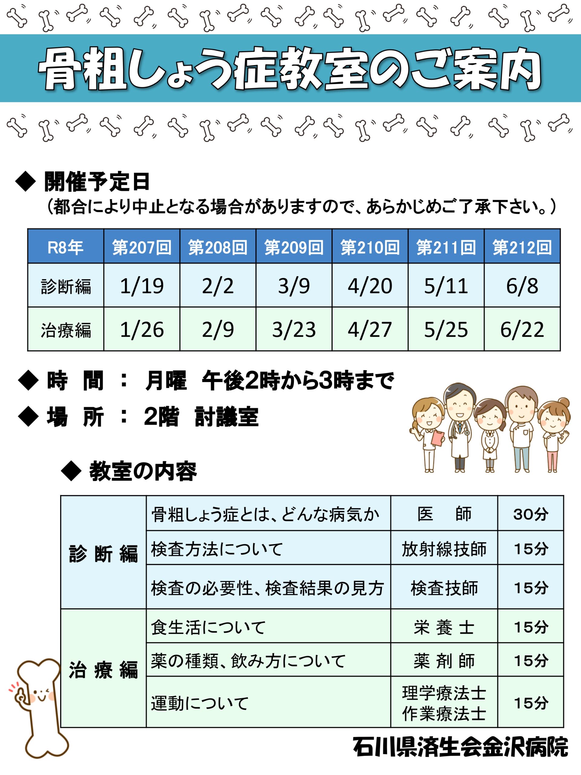 石川県済生会金沢病院では、糖尿病教室と骨粗しょう症教室を毎月開催しております。
