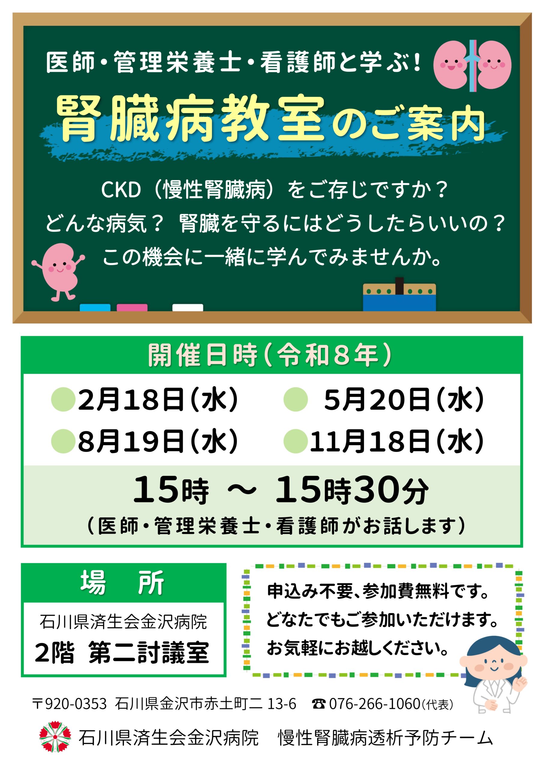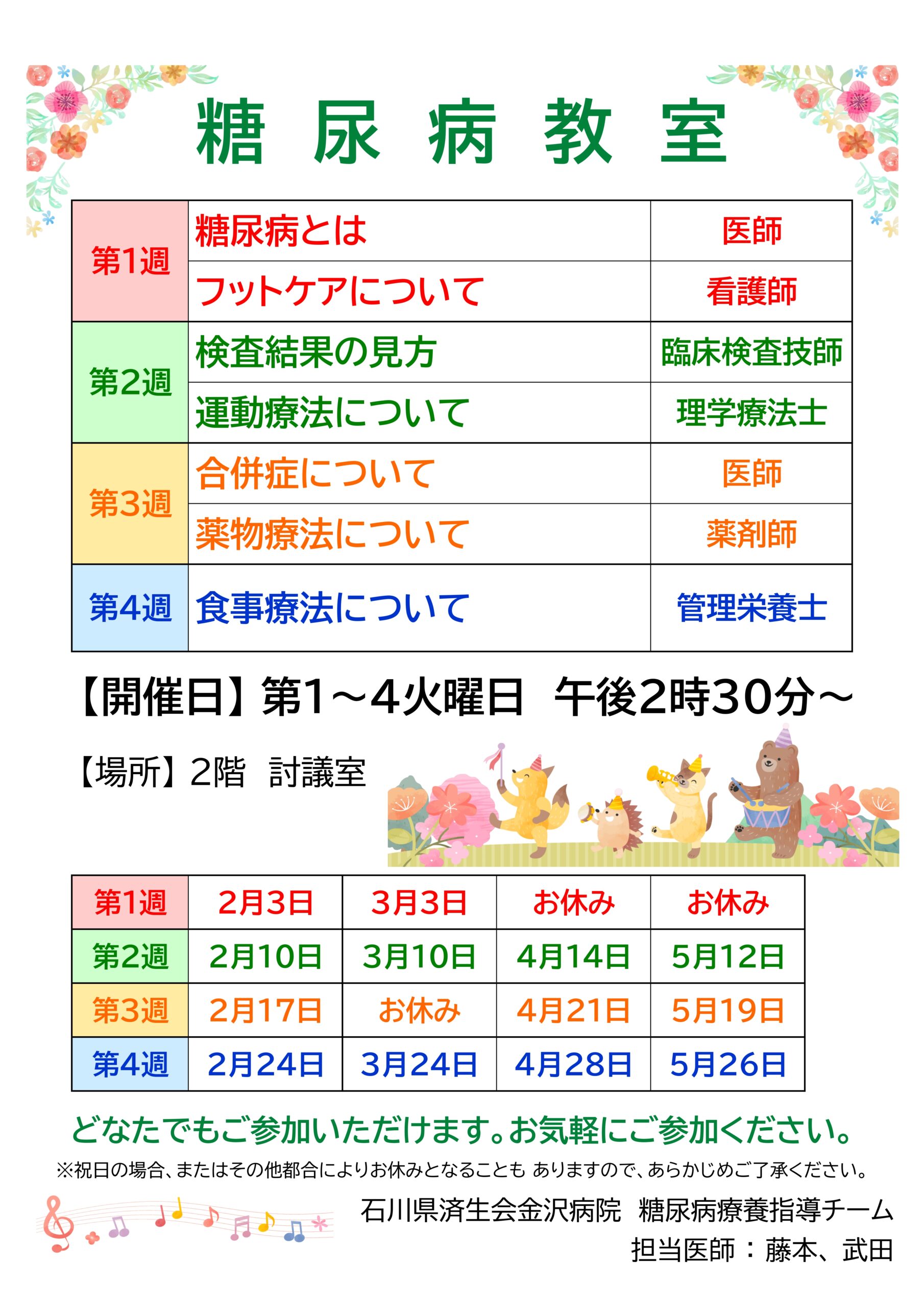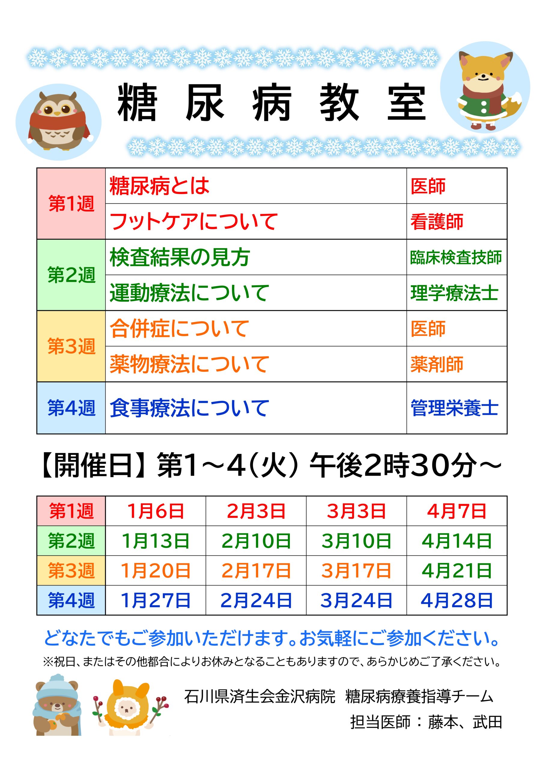 石川県済生会金沢病院では、糖尿病教室と骨粗しょう症教室を毎月開催しております。