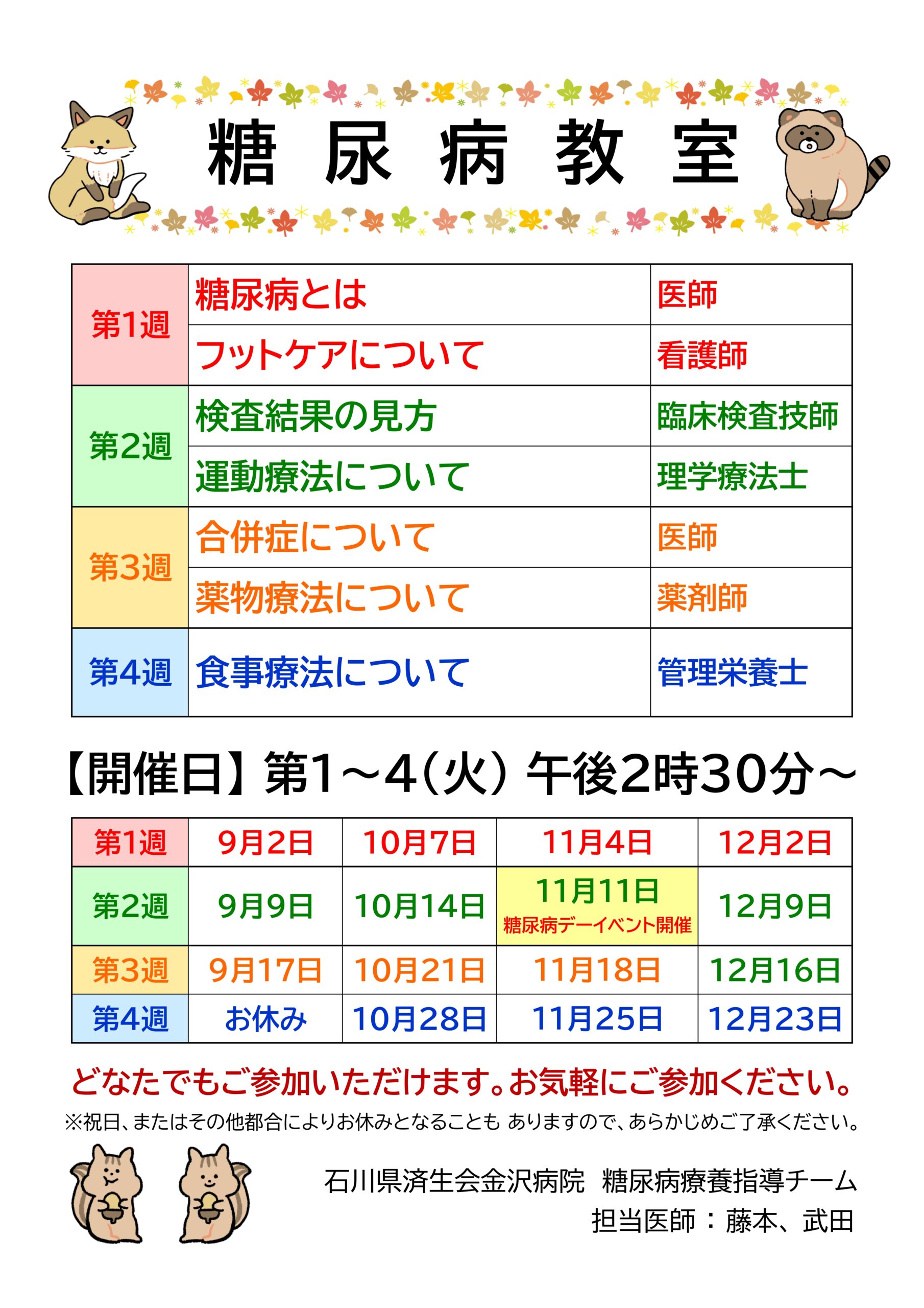 石川県済生会金沢病院では、糖尿病教室と骨粗しょう症教室を毎月開催しております。